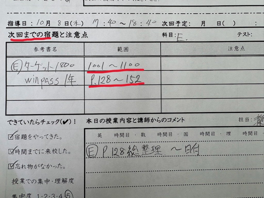 ・学校ワークはテスト前に全問正解、全単語暗記済み